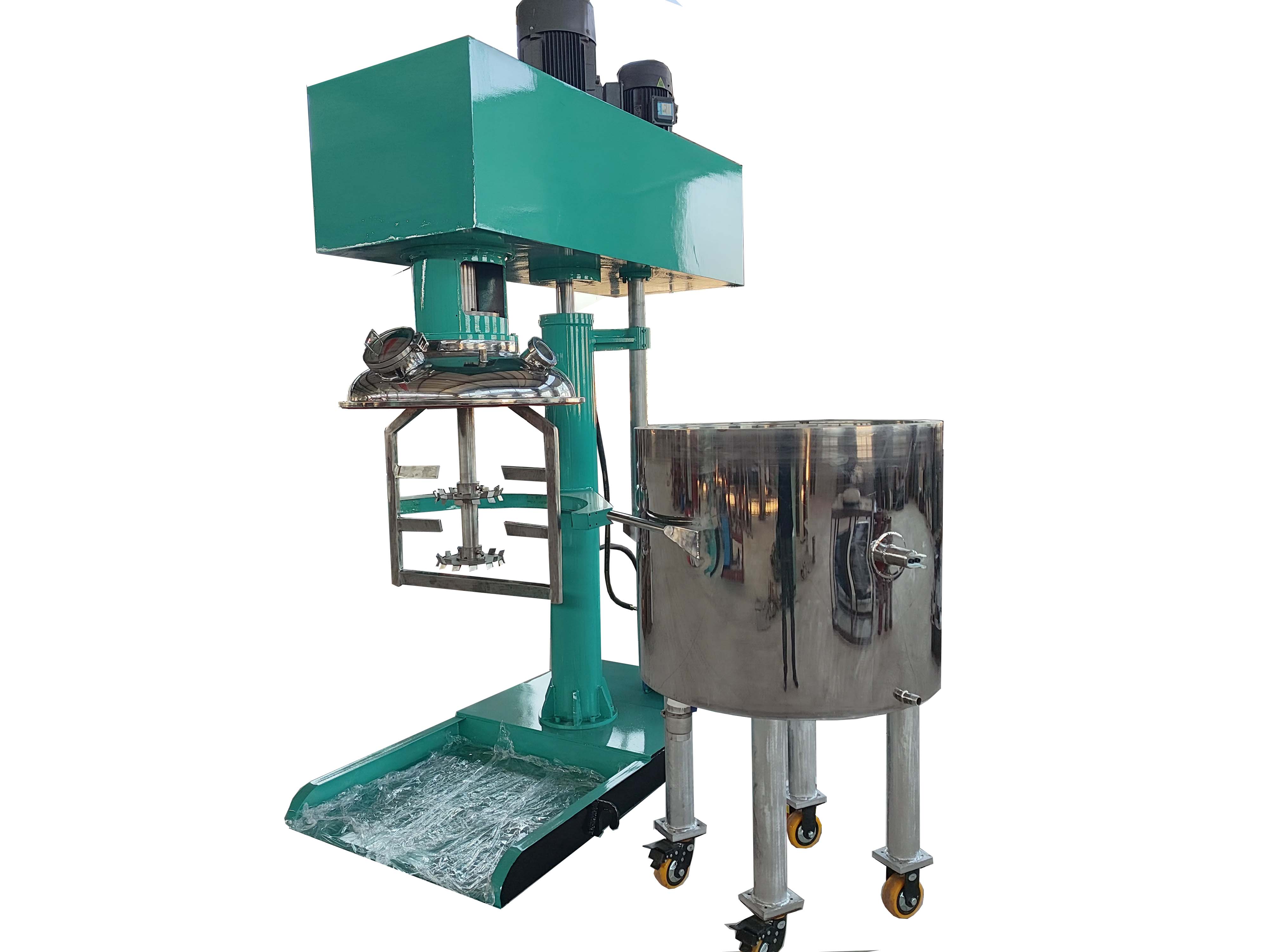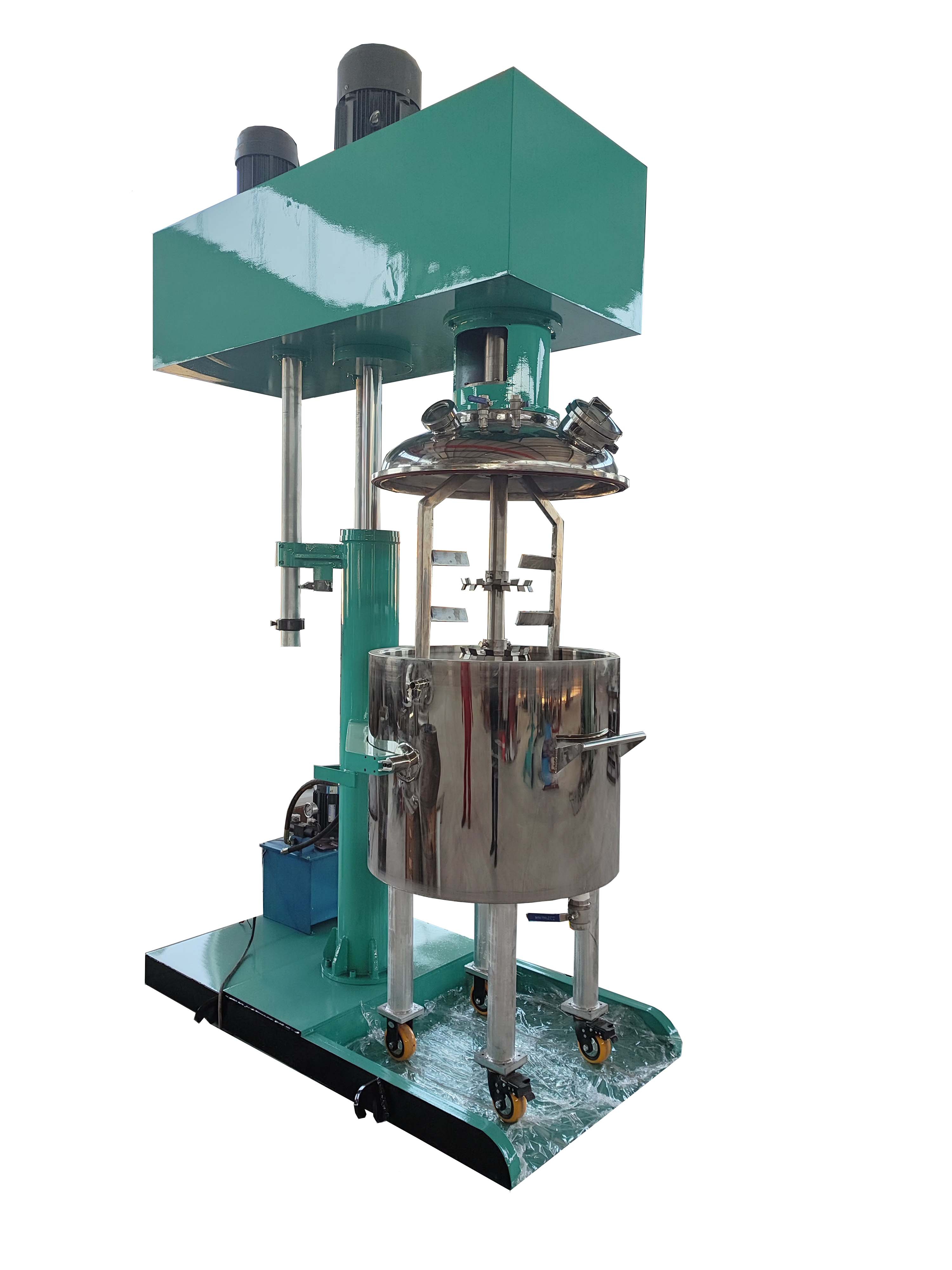高、低速雙動力設計;匹配的動能驅動高速分散器高速旋轉使攪拌缸內的液體物料呈現滾動的環流,并產生-定范圍的旋渦,物料同時受到較強的剪切和沖擊,配合帶有活動刮壁的低速攪拌器,把粘附在容器壁上的物料推向高速分散器的做功范圍,使兩種或兩種以上的物料很快得到分散、混合,使產品無色差、均勻度好、 透明度高。框式攪拌器主要解決拌合及物料粘壁問題,物料分散主要由中心分散器完成,從而各取所長,避其所短,使攪拌更快速,效率更高,混合更充分。根據工藝情況,高速實心軸與低速空心主軸間以及低速空心主軸與機架間均可安裝機械密封,從而實現真空作業。